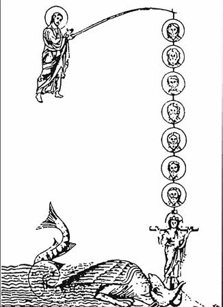 Дьявол, как и похожие на него люди, путает тень с тем, кто ее отбрасывает. Он соглашается на этот обмен. В результате Господь ловит дьявола на удочку, насадив на крючок Христа. Образ Христа на кресте напоминает наживку на крючке. В одной книге XII века под названием «Hortus Deliciarum» («Сад наслаждений»), написанной монахиней Херрад из Лансберга для обучения детей, Господь изображен в облике Бога Отца, который ловит рыбу. Вместо грузил на удочке изображены цари из дома Давида, на крючке висит Христос, а Левиафан – дьявол – поднимается из пучины и вот-вот клюнет на эту приманку. И вот он попался на крючок – вернее, на крест. Но поскольку Христос бессмертен, он смог спастись. Так и был обманут дьявол.