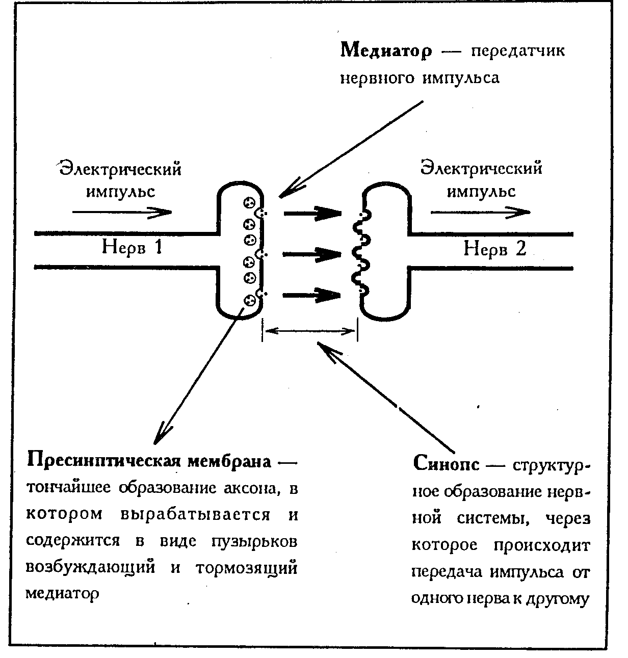 Рисунок 17.1. Передача импульса от одного нерва к другому. В нераздраженном волокне медиатор находится в пузырьках; при раздражении пузырьки лопаются и попадают в синоптическую щель. Приблизившись к мембране второго нерва, они взаимодействуют с ней. При этом повышается проницательность мембраны для ионов натрия и калия, что увеличивает возбудительный потенциал; как только он достигает критической величины, импульс распространяется по нервному волокну, следовательно, механизм передачи импульсов зависит от количества медиаторов.