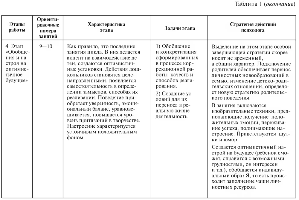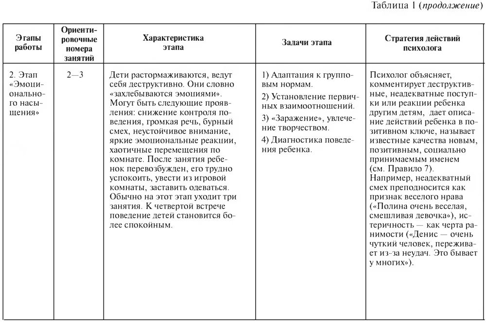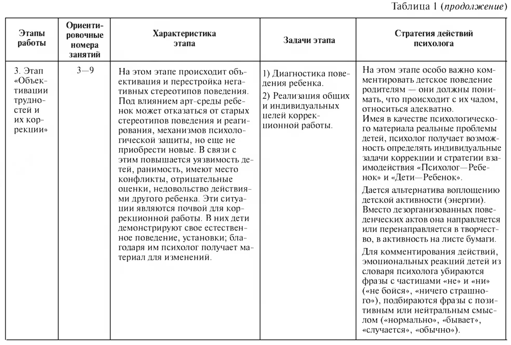 Арт-терапевтическая работа с детской группой проходит несколько этапов, каждый из которых имеет свои особенности. В таблице 1 описаны характеристики изменений поведения и аффективного реагирования детей, собранные в ходе проведения цикла занятий «Цветной мир». Смена этапов работы обусловлена задачами коррекции, из которых следует содержание заданий и приемов, а также определенная стратегия психологического воздействия.