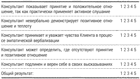 Супервизор отмечает техники слушания, использованные Консультантом; считает вопросы из каждой категории, заданные в процессе слушания. После завершения беседы Супервизор оценивает работу Консультанта по следующей шкале: 1 – очень мало; 2 – немного; 3 – достаточно, 4 – вполне; 5 – очень высоко.