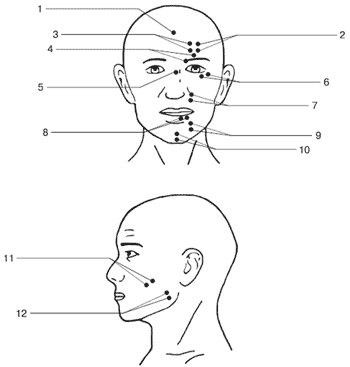 Рис. 18.1. Расположение электродов для записи активности основной мимической мускулатуры: 1 – Ground; 2 – Lateral Frontalis; 3 – Medial Frontalis; 4 – Corrugator Supercilii; 5 – Depressor Supercilii / Procesus; 6 – Orbicularis Oculi (Pars orbital); 7 – Levator Labii Superioris; 8 – Orbicularis Oris Inferior; 9 – Depressor Anguli Oris; 10 – Mentalis; 11 – Zygomaticus Major; 12 – Masseter.