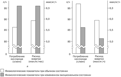 Рис. 18.2. Энерготраты и газообмен при выполнении одной и той же физической работы на различном эмоциональном фоне: а – при эмоциональном возбуждении, б – при апатии и скуке.