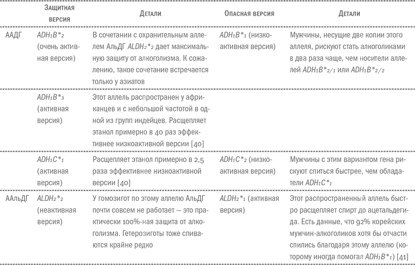 Нерасторопность или, наоборот, излишняя прыть определенных вариантов АДГ и АльДГ во многом объясняют, почему отдельные нации менее подвержены алкоголизму. В некоторых районах Восточной Азии ALDH2*2 есть у 50 % жителей, а у людей европейского и африканского происхождения этот вариант почти не встречается [34], [35], [36]. В Китае, Японии и Корее часто встречается шустрая версия алкогольдегидрогеназы ADH1B*2 (она же ADH2*2), которая очень быстро превращает весь спирт в ацетальдегид и обеспечивает своему носителю жестокую головную боль и прочие неприятные ощущения. У европейцев и африканцев этот защитный вариант редкость [37]. Зато от 15 до 25 % людей африканского происхождения несут аллель алкогольдегидрогеназы ADH1B*3 [38], который тоже кодирует высокоактивный фермент. У белых эта удачная в смысле защиты от алкоголизма версия не встречается. Всего исследователи нашли десяток охранительных и рисковых версий АДГ и АльДГ, самые изученные из них собраны в таблице ниже (из [39] с изменениями) (см. таблицу ниже).