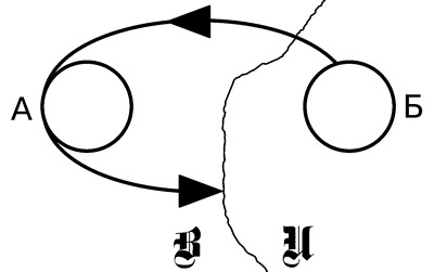 Рис. 6.1. Бэзил ушел в бессознательное (U готическое) и безнаказанно посылает либидо Алисе в сознание (B готическое). Алиса ответить тем же не может. Ее либидо зависает на границе. Классический пример неустойчивой диаграммы.