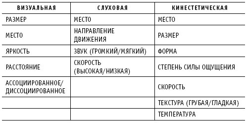 Поскольку этот подход отличается практичностью, я советую вам начать со следующих субмодальностей (таблица 9.3), поскольку они обычно оказываются более сильными. Далее вы, если нужно, можете перейти к другим субмодальностям.