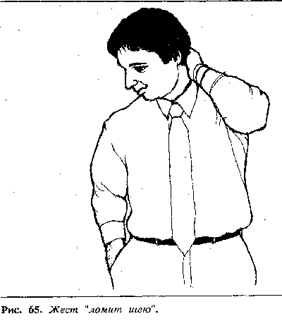 Утрированным вариантом жеста, выраженного оттягиванием воротничка, является потирание затылочной части шеи ладонью, то, что Калеро назвал жестом «ломит шею». Если человек проделывает этот жест во время произнесения лжи, он отводит глаза и смотрит в пол. Этот жест также является признаком расстройства или гнева, но в этом случае рука вначале хлопает по шее, а потом начинает потирать ее.