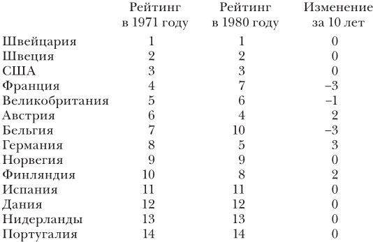 Приведу таблицу, показывающую результаты одного исследования, посвященного как раз этой теме. Оно оценивает США и тринадцать европейских стран примерно сопоставимого благополучия относительно количества изобретений, запатентованных из расчета на душу населения за 1971–1980 годы[101]. Таблица показывает, что у большинства стран рейтинг сохранялся на протяжении всего десятилетия.