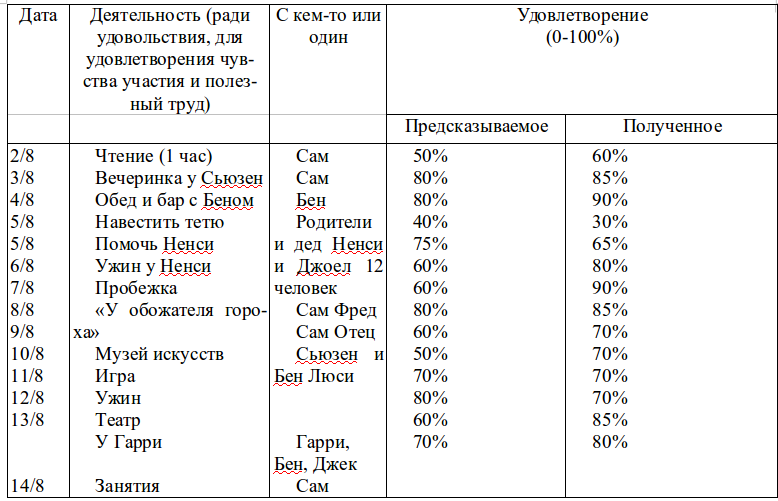 Избавиться от подобных аргументов поможет метод позитивных прогнозов (см. табл. 5.5). Составление в течение нескольких недель планов выполнения деятельности, увеличивающей потенциал личного роста, является основой метода. Деятельность может быть и одиночной и совместной. В последнем случае нужно указать в таблице партнера по работе и оценить предполагаемое удовлетворение (чувство участия и удовольствие) от нее (0-100%). В колонке «Действительное удовлетворение» записывается (после выполнения) истинный результат. Многие будут удивлены высокой степенью удовлетворения от дел, совершенных в одиночестве. Если кто выбрал ужин перед телевизором, то он не должен, конечно, его сравнивать с вечером, проведенным с друзьями во французском ресторане. В таблице 5.5 показана деятельность молодого человека, узнавшего, что его девушка, проживающая в другом городе, полюбила другого и не хочет больше встречаться. Но молодой человек не раскис и стал активно работать. В таблице можно заметить, что удовлетворение, испытанное юношей от работы в одиночестве, от 60-90%, тогда как в совместной деятельности — 30-90%. Это подняло его уверенность в себе, так как он понял, что потеря девушки не обрекает его на жалкое существование.