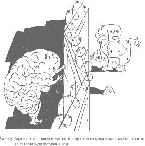 Но вернемся к гематоэнцефалическому барьеру. Клетки составляющих его сосудов подогнаны настолько плотно, что даже наползают друг на друга, образуя нечто вроде черепицы на крыше. Благодаря такой структуре между клетками не остается щелей, сквозь которые крупные и потенциально опасные молекулы могли бы пролезть и отравить бесценный мозг. Сосуды гематоэнцефалического барьера лежат в трехмерном кружеве из отростков астроцитов. У каждого из них есть множество ножек, за что их часто называют «звездчатыми клетками». Ножки присасываются к стенкам капилляров и вытягивают из них исключительно полезные и необходимые мозгу вещества, в том числе глюкозу (хотя иногда они обманываются и доставляют прямиком в наш центральный процессор менее полезные вещества вроде героина). Кроме того, глюкоза сложным образом поступает через ликвор – окружающую мозг жидкость.