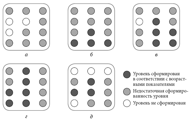 Рис. 6.2. Паттерны сформированности уровневых систем триады базовой структурной организации для различных групп отклоняющегося развития: а – вариант тотального недоразвития (легкая степень); б – темпово-задержанное развитие (гармонический инфантилизм); в – парциальное недоразвитие преимущественно регуляторного компонента деятельности; г – дисгармоничное развитие; д – искаженное развитие преимущественно когнитивной сферы ветствии с обозначениями матрицы для отдельных вариантов недостаточного и асинхронного типов развития.
