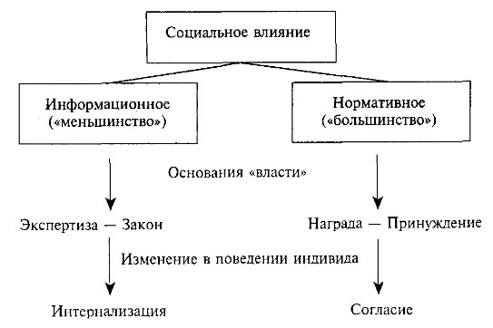 Дальнейшие исследования феномена конформности привели к выводу о том, что давление на индивида может оказывать не только большинство группы, но и меньшинство. Соответственно М. Дойчем и Г. Джерардом были выделены два вида группового влияния: нормативное (когда давление оказывает большинство, и его мнение воспринимается членом группы как норма) и информационное (когда давление оказывает меньшинство, и член группы рассматривает его мнение лишь как информацию, на основе которой он должен сам осуществить свой выбор) (рис. 12). Таким образом, проблема влияния большинства и меньшинства, проанализированная С. Московией, имеет большое значение и в контексте малой группы.