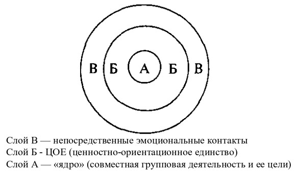 В отечественной социальной психологии новые принципы исследования сплоченности разработаны А.В. Петровским. Они составляют часть единой концепции, названной ранее «стратометрической концепцией групповой активности», а позднее — «теорией деятельностного опосредования межличностных отношений в группе». Основная идея заключается в том, что всю структуру малой группы можно представить себе как состоящую из трех (в последней редакции четырех) основных слоев, или, в иной терминологии, «страт»: внешний уровень групповой структуры, где даны непосредственные эмоциональные межличностные отношения, т.е. то, что традиционно измерялось социометрией; второй слой, представляющий собой более глубокое образование, обозначаемое термином «ценностно-ориентационное единство» (ЦОЕ), которое характеризуется тем, что отношения здесь опосредованы совместной деятельностью, выражением чего является совпадение для членов группы ориентации на основные ценности, касающиеся процесса совместной деятельности. Социометрия, построив свою методику на основе выбора, не показывала, как отмечалось, мотивов этого выбора. Для изучения второго слоя (ЦОЕ) нужна поэтому иная методика, позволяющая вскрыть мотивы выбора. Теория же дает ключ, при помощи которого эти мотивы могут быть обнаружены: это — совпадение ценностных ориентации, касающихся совместной деятельности. Третий слой групповой структуры расположен еще глубже и предполагает еще большее включение индивида в совместную групповую деятельность: на этом уровне члены группы разделяют цели групповой деятельности, и, следовательно, здесь могут быть выявлены наиболее серьезные, значимые мотивы выбора членами группы друг друга. Можно предположить, что мотивы выбора на этом уровне связаны с принятием также общих ценностей, но более абстрактного уровня: ценностей, связанных с более общим отношением к труду, к окружающим, к миру. Этот третий слой отношений был назван «ядром» групповой структуры.