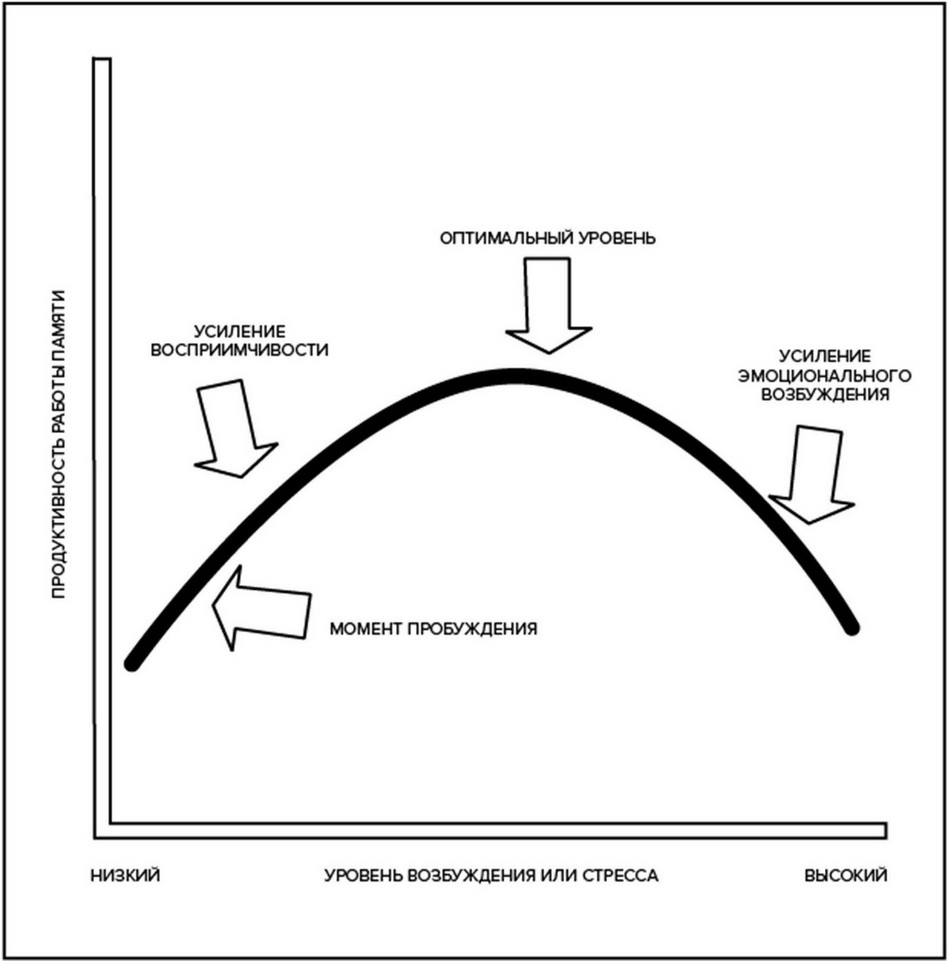 — Повторим еще раз главное, — сказала я, указывая на правую часть кривой, — высокие уровни возбуждения или стресса резко понижают нашу способность обрабатывать информацию и хранить ее в памяти. Многие люди ошибочно полагают, что мощный стресс усиливает память, и это ошибочное представление как раз и зафиксировано в заявлении: «О боже, я так испугалась, что никогда не забуду это лицо!» На самом деле сильный стресс может лишь ослабить память.