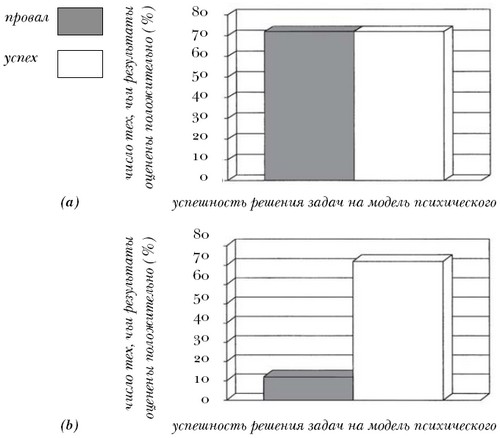 Рис. 5. Процентное соотношение аутистов, которые демонстрировали способность к узнаванию (а) радости и горя («активные" пункты опросника) и (Ь) смущения и удивления („интерактивные“ пункты опросника) (из Frith и др. 1994).