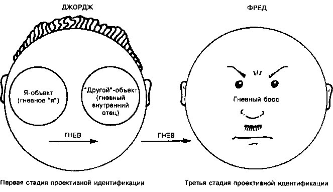 Впоследствии созданный Джорджем «я» — образ вызывал, вероятно бессознательно, страдания у своего создателя. Если бы ему, как и отцу, было свойственно показывать свое раздражение в гневе, он вел бы себя агрессивно по отношению к матери — так, как это делал его отец. Это была бы его защита от психической боли осознания, осуществленная с помощью проекции ролей назад, в «другой» — объект своей психики (первая стадия проективной идентификации по Сандлеру).