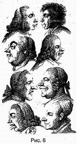 Лафатер сначала изучал психологические особенности человека, пользуясь для этого признаниями прихожан на исповеди, а затем сопоставлял полученные данные с особенностями черт лица. Таким образом были записаны тысячи хорошо известных ему лиц, и на основании этого материала сделаны выводы о взаимосвязи формы профиля и внутреннего склада человека. Так, он считал, что в строении и очертаниях черепа и лба отражается умственная жизнь человека; а в, строении лицевых мускулов, очертаниях носа и щек — моральная и эмоциональная жизнь; а складка рта и линия подбородка сообщают о чувственных, животных качествах (рис. 6).