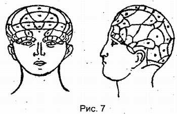 Галль создал подробные карты мозга (рис. 7), где указал места концентрации моральных и интеллектуальных качеств человека. Он утверждал, что по форме и местонахождению выпуклостей и впадин на черепе можно определить характер, наклонности и умственные способности человека. С помощью специальных измерений он определял «шишки способностей» к музыке, поэзии и живописи, «бугры» честолюбия, скупости, храбрости материнской любви и т. д.