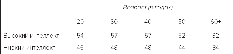 Участники как с высоким, так и с низким уровнем интеллекта показали ухудшающуюся с возрастом способность к запоминанию. Похоже, механизм припоминания лучше всего работает у людей в возрасте сорока с небольшим лет. Серьезные ухудшения наблюдаются у тех, кому чуть меньше шестидесяти.