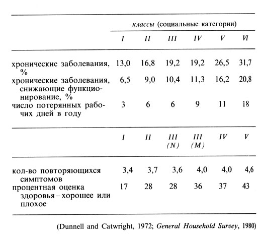 Теперь перейдем к рассмотрению заболеваний, которые наиболее распространены внутри различных классов. Довольно трудно вывести какие-либо репрезентативные цифры, так как структура здоровья время от времени меняется; варьируется она и при сопоставлении данных по разным странам. Наиболее распространенными заболеваниями в низших классах являются: инфекционные заболевания, например туберкулез; заболевания респираторной системы, включая пневмонию, бронхит и грипп; большинство видов рака, включая рак легких; болезни пищеварительной системы, включая язву и цирроз печени; несчастные случаи на работе и вне ее (Reid, 1982).