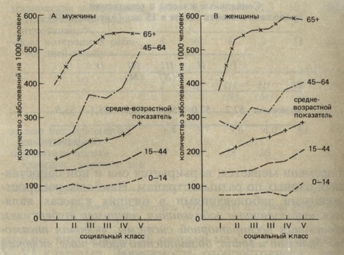Рис. 10.2. Хронические заболевания и социальное положение: А-мужчины 1974-1976; В-женщины 1974-1976. (Black, 1980)