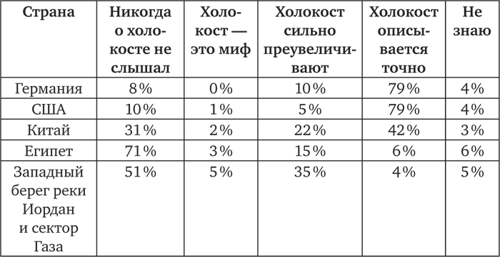 Больше всего недоумения вызвало количество тех, кто утверждает, что никогда не слышал о холокосте. В США свое невежество признали лишь 10 %, но для Египта этот показатель составил 71 %, а для Индонезии – 90 %. В странах Ближнего Востока большинство людей ответили, что никогда не слышали о геноциде, способствовавшем образованию Израиля как самостоятельного государства, – событии, которое в настоящее время влияет на политические и военные события региона.