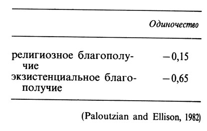 Согласно недавно проведенному американскому исследованию, верующие люди реже чувствуют себя одинокими. В процессе исследования были использованы различные методы анкетного опроса, результаты представлены в табл. 6.4. Зависимость между религиозностью и одиночеством (или его отсутствием) наиболее четко прослеживалась по шкале "экзистенциальное благополучие", которая включала также утверждения, как, например: "Я чувствую, что в моей жизни есть какая-то реальная цель" и "Я не знаю, кто я и откуда, к чему иду" (пункты с обратным порядком подсчета оценок). Эти позиции в принципе не стоит особенно ассоциировать с посещением получив церкви как таковой, так как они скорее выражают чувства смысла и цели, которые, как будет показано ниже, связаны с ощущением счастья. Религиозное благополучие отражалось в более традиционных утверждениях, как, например: "Я верю, что Бог любит меня и заботится обо мне". В силу того что эта шкала была также соотнесена с одиночеством (или его отсутствием), корреляция в данном случае была значительно слабее (Paloutzian and Ellison, 1982).