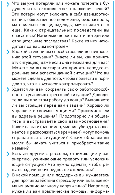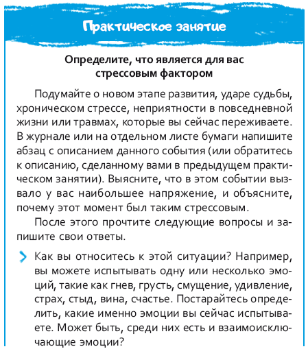 На стрессовую реакцию на уровне тела, помимо характера события, влияет и то, как вы воспринимаете и оцениваете сложившуюся ситуацию. Нижеследующее практическое занятие поможет вам лучше понять свою реакцию на стресс, независимо от того, с какого рода стрессором вы столкнулись. Благодаря этому вы поймете, почему испытываете такое эмоциональное напряжение и как вам изменить свое мышление или какие меры принять для улучшения своего положения. Помимо этого вы научитесь шире смотреть на вызывающие стресс факторы и свои реакции на них и своевременно снимать нервно-психическое напряжение, а не стараться забыть о нем.