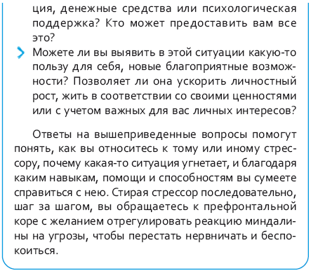 Если вы переживаете последствия какого-то удара судьбы (скажем, развода или смерти близкого человека), неизбывной стрессовой ситуации или нарастания неприятностей в повседневной жизни, тогда для вас, скорее всего, будут полезны техники, изложенные как во второй части, так и в третьей – «Улучшение качества своей жизни с помощью префронтальной коры». Вам нужно не только понять свои эмоции и успокоиться, но и перестроиться. Если вы научитесь воспринимать трудные ситуации как новые возможности, преодолеете негативное мышление, будете настраивать себя на хорошее и проявлять упорство, то все это поспособствует вашему прогрессу. Начав формировать здоровые привычки, вы заложите первый камень в фундамент своей стрессо-устойчивости.