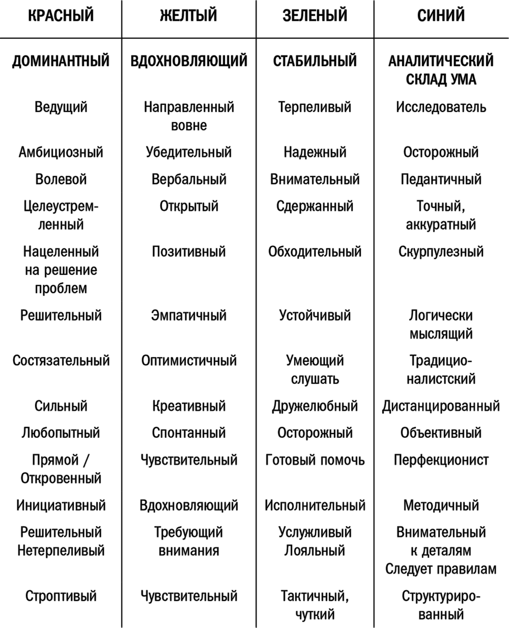 Но, разумеется, может возникнуть и обратный эффект. Прочитав некоторые фрагменты, вы обнаружите, что вы и сами ведете себя как босс, именно так, как это делают красные. Или, может быть, вы поймете, что вы слишком много говорите, как желтые. А может случиться и так, что вы слишком заторможены и не можете заставить себя начать какой-нибудь проект, как зеленые. Или вы слишком подозрительны, как синие, и вам всюду мерещатся опасности и риски. Читая эту книгу, вы научитесь видеть недостатки и недочеты в собственном характере и поведении и начнете действовать таким образом, чтобы обойти их.