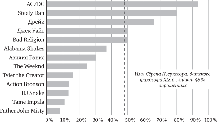 Только три исполнителя 2015 г. уверенно преодолели 50 %-й рубеж узнаваемости по имени. И все трое стоят особняком: культовые для беби-бумеров AC/DC и Steely Dan, и с ними ультракоммерческий Дрейк. Модные исполнители, этот рубеж не преодолевшие, уступают по узнаваемости… ну вот хотя бы датскому философу Сёрену Кьеркегору (которого по имени знают 48 % опрошенных). Среди взрослых американцев музыкальные знания мало у кого актуальны.