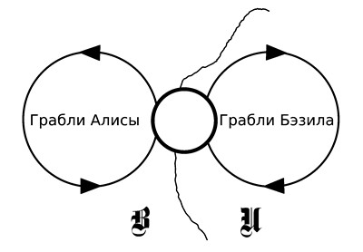 Рис. 6.12. Зеркальная пара вихрей по разные стороны границы сознания и бессознательного. Алиса и Бэзил в них участвуют, но уже на вторых ролях.