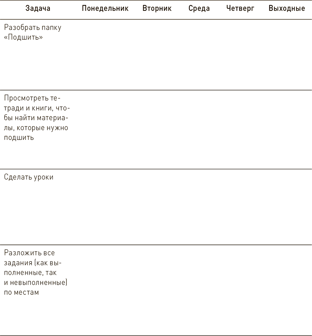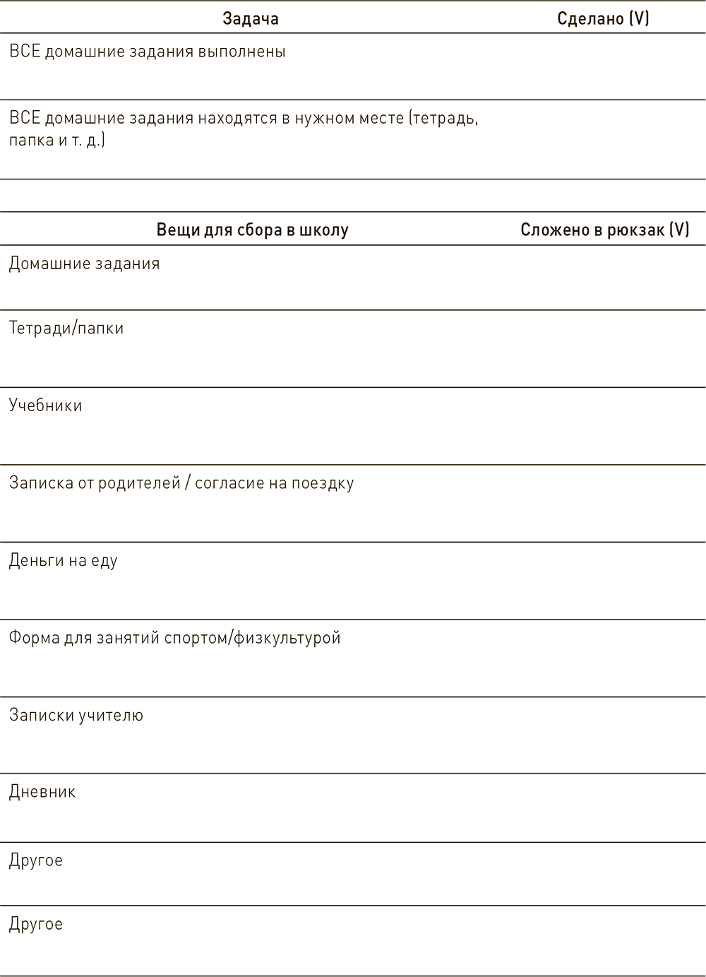 1. Вместе с ребенком составьте план занятий и задач (табл. 10.21). Можно создать план дня или список событий, которые происходят в течение дня. Включите обязательные мероприятия (время приема пищи и отхода ко сну и т. п.) и регулярные занятия (уроки и спорт).