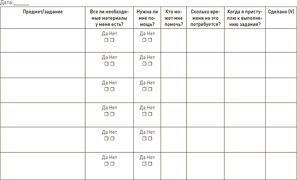 Необходимые организационные навыки: начало работы (глава 15), устойчивое внимание (глава 14), рабочая память (глава 12).