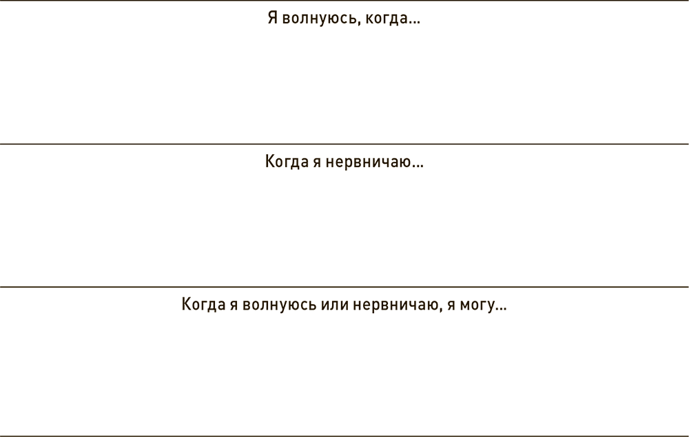 1. Составьте вместе с ребенком список ситуаций, в которых он начинает беспокоиться. Подумайте, не прослеживается ли в них определенная схема и нельзя ли объединить их в категории (например, у ребенка, нервничающего на футбольном поле, у классной доски или на сцене, может быть страх перед выступлением: он нервничает, когда нужно выступать перед другими).