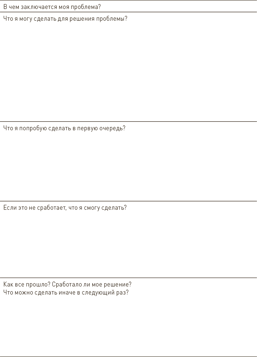 После того как вы проделали всю процедуру (см. табл. 10.23) несколько раз вместе, решая различные проблемы, возможно, ребенок уже сможет сам использовать «рабочий лист». Поскольку вы стараетесь поощрять самостоятельное решение проблем, можно попросить ребенка сначала самому заполнить рабочий лист и только потом обратиться к вам за помощью (при необходимости). В конце концов ребенок усвоит весь процесс и сможет решать проблемы «с лету».
