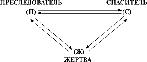 Анализировать игры второго класса удобно, используя драматический треугольник С. Карпмана (рис. 10). В играх люди проигрывают одну из трех ролей: Жертва, Спаситель, Преследователь. Жертва признает свое неблагополучие, игнорирует свою способность самой решать свои проблемы и ищет помощи. Получая помощь от Спасителя, она подтверждает свое неблагополучие и беспомощность. Когда же жертва находит Преследователя, он унижает ее или ставит на место. Спаситель считает себя благополучным и, исходя из своего более высокого положения, игнорирует возможности других людей, считая их неблагополучными. Преследователь, считая себя благополучным, нуждается в том, чтобы вокруг были неблагополучные люди. Он игнорирует их способности и возможности.