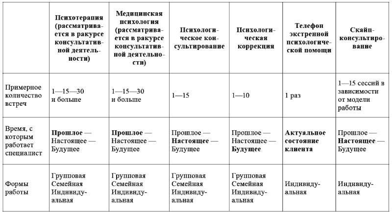 Для того чтобы обозначить область психологического консультирования более четко, мы также предпримем попытку разграничения описанных областей, осознавая, что во многом подобное разделение относительно и представляет собой лишь ориентир для целостного видения ситуации. Для этого мы заполним таблицу, которая и поможет нам сориентироваться в пространстве (табл. 1.1, с. 34–35).