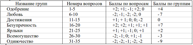 Заполнив эту таблицу, следует оценить так каждый ответ: