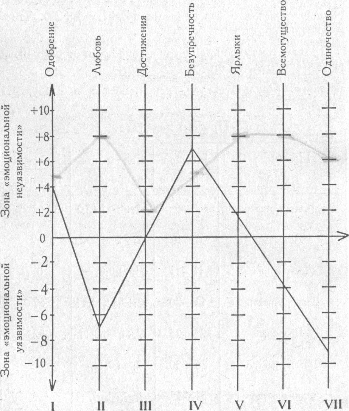 Человек, результаты тестирования которого я привожу, неуязвим в областях: одобрение, безупречность, ярлыки. Но его слабые места: любовь, одиночество, всемогущество. Значение этих терминов будет описано ниже. Сначала нужно просто узнать таким образом концепцию своего поведения.