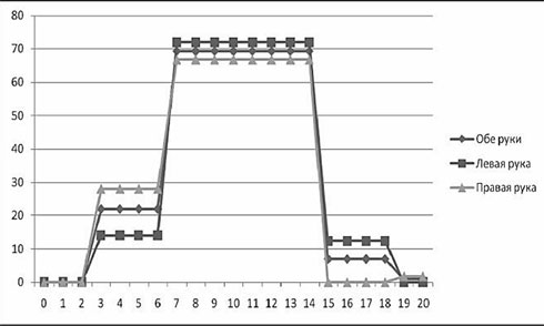 Рассмотрим графики распределения количества иллюзий в экспериментальных группах. При патологии правого полушария мозга графики правой руки и обеих рук сохраняют «нормальную» тенденцию; график левой руки – нет (рис. 7). Изменения «нормальной» тенденции касаются только левой руки, а это может указывать на то, что изменения в работе правого полушария не влияют на качественные изменения процесса установки (то есть показатели усредненного графика обеих рук).