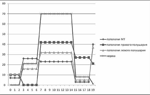 При патологии МТ левая рука сохраняет «нормальную» тенденцию, а двурукий график и график правой руки – нет (рис. 9).