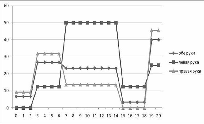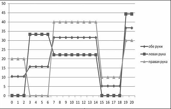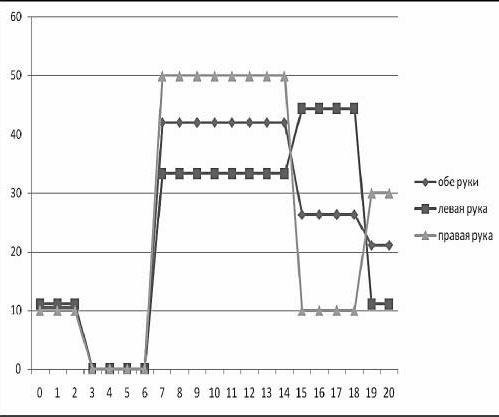 При патологии левого полушария мозга график правой руки сохраняет нормальную тенденцию, а графики левой руки и обеих рук – нет (рис. 8).
