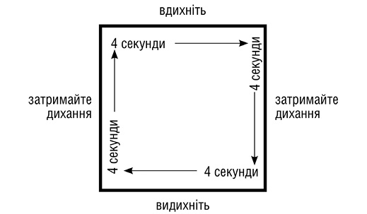 Марк Міллер40 описує себе як поета-воїна, випадкового героя і студента-науковця. Він також спецпризначенець із досвідом участі в бойових діях, і його описи тактичних технік дихання, використовуваних військовими, неймовірно мені допомогли. Я навіть навчила їм своїх дітей. Під час інтерв’ю військові ветерани, чинні військовослужбовці й рятувальники розповідали мені, що покладаються на ці техніки, щоб заспокоїтися і зосередитися, не лише в кризових ситуаціях, а також і в особистому житті. Один пожежник сказав мені, що нещодавно використав цю техніку, сперечаючись із сином-підлітком з приводу домашнього завдання. Ось пояснення техніки тактичного дихання Марка Міллера.