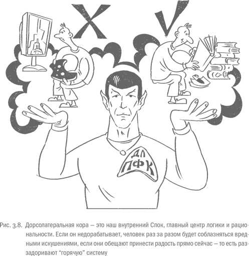 Благодаря недюжинным способностям к анализу и оценке Спок вычленяет из происходящего самое главное (например, понимает, что новый эпизод сериала закончится в половине второго ночи, а в семь утра надо вставать на работу) и удерживает это главное в рабочей памяти. Дорсолатеральная префронтальная кора сравнивает два стимула, объекта или возможности на предмет их относительной ценности. Если предложить людям с повреждениями длПФК рассортировать карточки с рисунками, руководствуясь каким-либо правилом, а потом это правило поменять, они продолжат раскладывать карточки так, как делали изначально. И, похоже, этот регион мозга очень во многом отвечает за то, насколько сильна будет наша мотивация во что бы то ни стало добиться задуманного, несмотря на многочисленные соблазны.