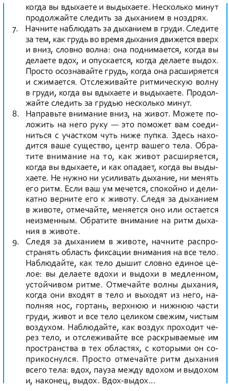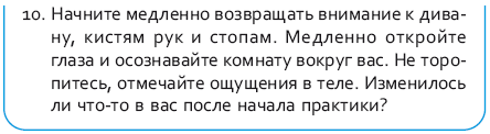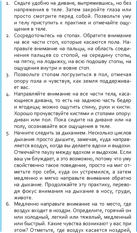 Дыхание становится мощным центром притяжения для внимания, но это не единственный способ развития осознанности. Для того чтобы создать ощущение осознания настоящего момента и внутреннего мира, можно использовать и чувства, как это происходит в следующей практике.