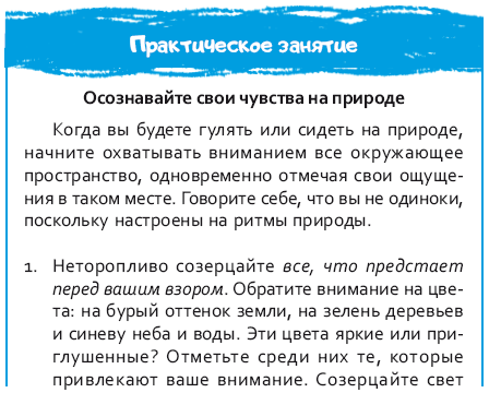 Для практики осознания чувств прекрасно подходит прогулка на природе. Вообще прогулки, и в особенности на природе, оказывают успокаивающее влияние на мозг и весь организм. Но даже если у вас нет возможности покинуть дом, то вы все равно сможете практиковать осознание своих чувств, приспосабливая нижеследующую практику к своей ситуации. Вы можете сидеть на террасе или в саду или просто смотреть в окно, разглядывать картины и фотографии пейзажей природы.