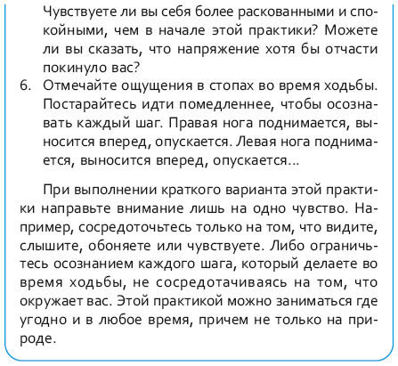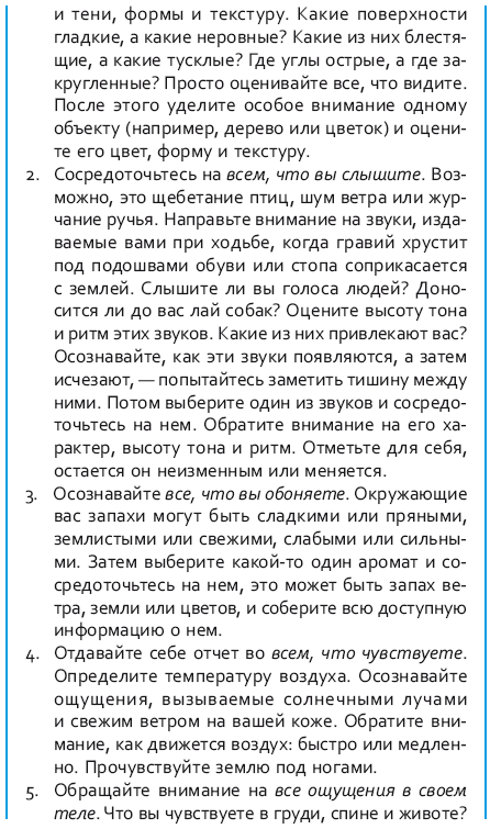 Когда миндалина звонит во все колокола, вы теряете связь с настоящим моментом, поскольку в вас запускается реакция на чрезвычайную ситуацию. Вы можете почувствовать острую необходимость что-то предпринять в отношении стрессора или убежать от захлестнувших вас чувств. Если же вместо этого вы умышленно сосредоточиваете внимание на чувствах, то переходите от установки ума к действию, достижению или избеганию в режиме осознания и описыванию того, что окружает вас. Благодаря этому усиливается ощущение контакта с реальностью. Мы соединены с внешним миром через чувства. Если мы осознаем то, что находится вокруг нас, то воспринимаем себя как часть более обширного мира из одушевленных и неодушевленных объектов. Соединение со своими чувствами также может быть способом сделать то, что психолог Рик Хансон[48] (2009) называет поглощением благотворного, то есть целенаправленно настроить мозг на удержание в центре внимания приятных и успокаивающих вещей с целью снять стрессовую реакцию.