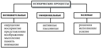 Психические процессы – динамическое отражение действительности в различных формах психических явлений. Психический процесс – это течение психического явления, имеющего начало, развитие и конец. При этом нужно иметь в виду, что конец одного психического процесса тесно связан с началом другого. Отсюда – непрерывность психической деятельности в состоянии бодрствования человека. Психические процессы вызываются как внешними воздействиями на нервную систему, так и раздражениями, исходящими от внутренней среды организма. Все психические процессы подразделяют на познавательные, эмоциональные и волевые (рис. 5).