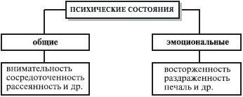 Психические состояния – это определенный в данное время относительно устойчивый уровень психической деятельности, который проявляется повышенной или пониженной активностью личности. Каждый человек ежедневно испытывает различные психические состояния (рис. 6). При одном психическом состоянии умственная или физическая работа протекает легко и продуктивно, при другом – трудно и неэффективно. Психические состояния имеют рефлекторную природу, возникают под влиянием определенной обстановки, физиологических факторов, времени и т. д.