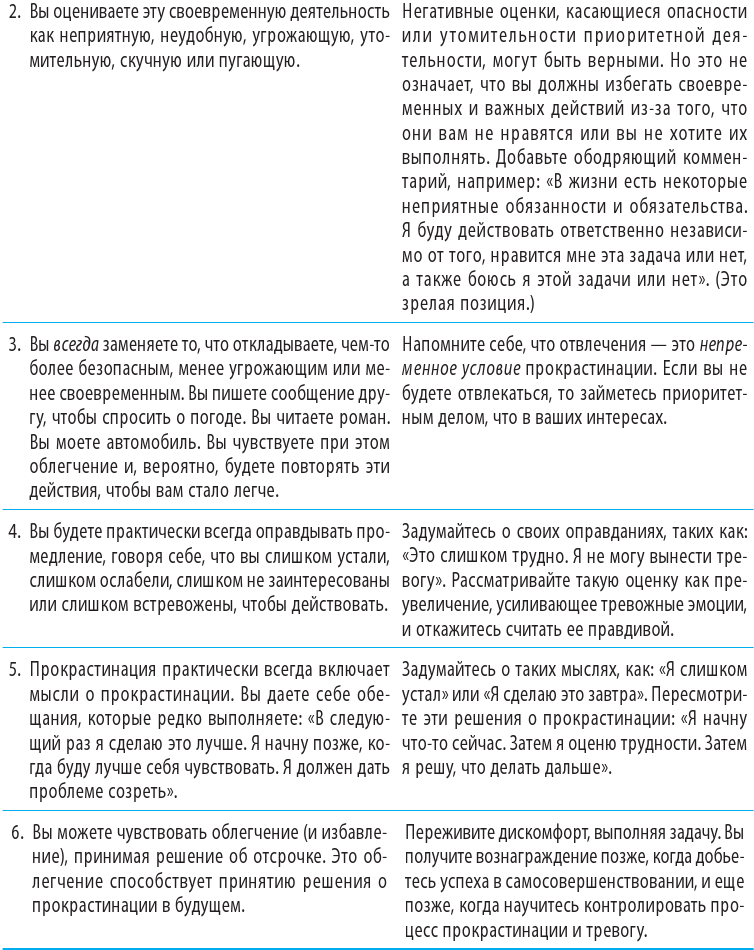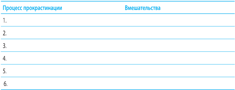 Прокрастинация – это автоматическая проблемная привычка неоправданно откладывать своевременные, значимые, приоритетные действия на другой день или время. Но для того, чтобы понять, как действует прокрастинация, вы должны рассматривать ее как живой процесс с определенными стадиями. Вы можете разбить процесс прокрастинации на обычно наблюдаемые фазы. В левом столбце следующей таблицы описан пример процесса прокрастинации с указанием стадий. В правом – примеры вмешательств на каждой стадии.